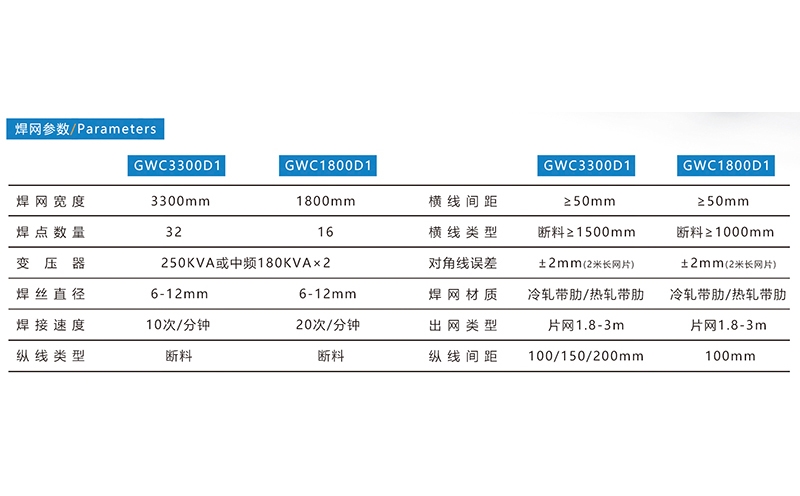 鋼筋網(wǎng)焊接生產(chǎn)線,焊接網(wǎng)寬度3300mm和1800mm兩種,焊接絲徑6-12mm,焊接速度分別為10次/分鐘和20次/分鐘,縱橫線均為斷料。標(biāo)準(zhǔn)配置:縱線托絲平臺、焊接主機、增料料斗、伺服拉網(wǎng)??蛇x配置:空壓機、工業(yè)冷水機、橫線自動折彎+出網(wǎng)小車、縱線自動折彎+出網(wǎng)小車、出網(wǎng)托輥。河北驕陽焊工有限公司,0318-7063097