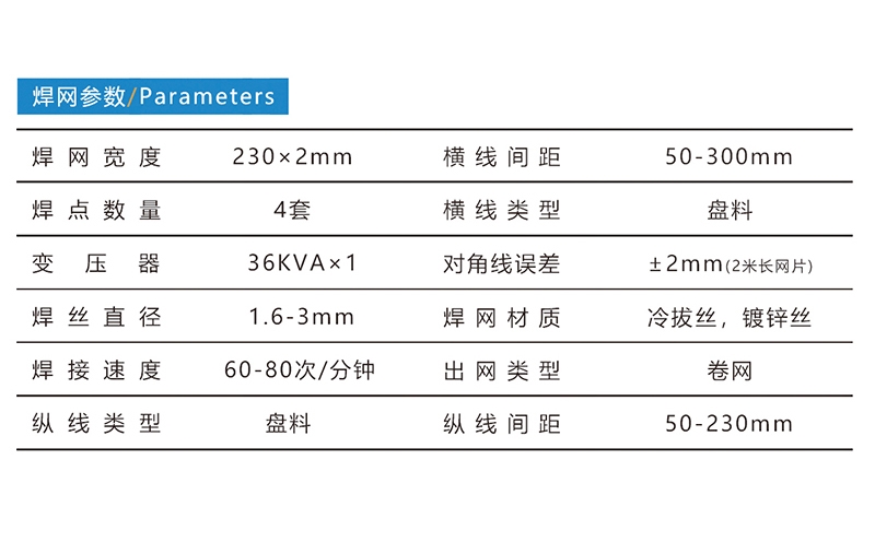 磚帶網(wǎng)焊接生產(chǎn)線,采用盤絲入料,自動校直焊接,焊網(wǎng)寬度230mm×2,焊接絲徑1.6-3mm,焊點(diǎn)數(shù)量4套,焊接速度約60-80次/分鐘,出網(wǎng)形式為卷網(wǎng)。標(biāo)準(zhǔn)配置:放線盤、導(dǎo)線架、緩料裝置、縱線橫線校直系統(tǒng)、橫線切斷裝置、伺服送網(wǎng)??蛇x配置:空壓機(jī)。河北驕陽焊工有限公司,0318-7063097