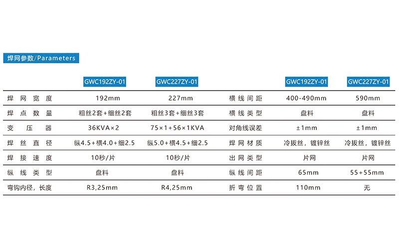 養(yǎng)殖網(wǎng)橫拉籠門焊接生產(chǎn)線,焊網(wǎng)寬度192mm/227mm,焊接絲徑4.5+4.0+2.5mm/5.0+4.5+2.5mm,焊接速度為10秒/片,橫線縱線均為盤料。標(biāo)準(zhǔn)配置:GWC190ZY-01:放線盤、儲(chǔ)料架、校直、叼絲、橫線校直送料系統(tǒng)、主機(jī)、自動(dòng)折彎、自動(dòng)剪網(wǎng)、接網(wǎng)架。GWC227ZY-01:放線盤、主機(jī)、自動(dòng)折彎、自動(dòng)剪網(wǎng)、接網(wǎng)架。河北驕陽焊工有限公司,0318-7063097