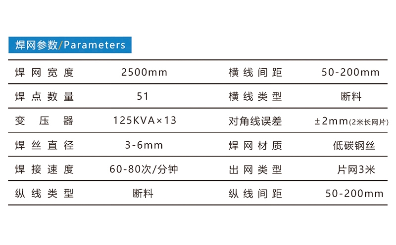 全自動(dòng)圍欄網(wǎng)焊接生產(chǎn)線,焊接網(wǎng)寬度2500mm,焊接絲徑3-6mm,焊接速度為60-80次/分鐘,縱線橫線均為斷料。標(biāo)準(zhǔn)配置:縱線自動(dòng)布料、橫線增料料斗、焊接主機(jī)、伺服拉網(wǎng)、自動(dòng)折彎、自動(dòng)出網(wǎng)、自動(dòng)抓取堆垛、工業(yè)冷水機(jī)。可選配置:出網(wǎng)托輥、縱線托絲平臺(tái)、堆垛小車、空壓機(jī)、中頻焊接系統(tǒng)。河北驕陽(yáng)焊工有限公司,0318-7063097