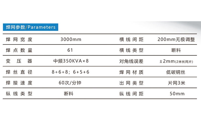 雙絲圍欄網(wǎng)焊接生產(chǎn)線,焊接網(wǎng)寬度3000mm,焊接絲徑8+6+8mm/6+5+6mm,焊接速度為60次/分鐘,縱線橫線均為斷料。標(biāo)準(zhǔn)配置:縱線托絲平臺(tái)、橫線增料料斗、焊接主機(jī)、伺服拉網(wǎng)。可選配置:自動(dòng)折彎、縱線自動(dòng)布料+自動(dòng)送料、自動(dòng)抓取堆垛、堆垛小車、出網(wǎng)平臺(tái)、空壓機(jī)、中頻焊接系統(tǒng)。河北驕陽焊工有限公司,0318-7063097